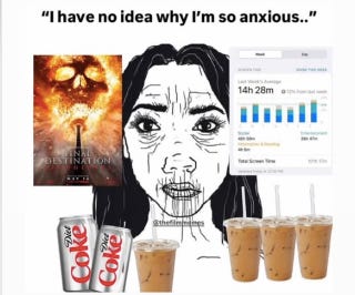 Now I would feel settled with this definition, if only it wasn’t for one sneaking truth. That when it comes to human psychology - and explanations of it - simple is almost always more precise than complex. This is where I force you all to admit that fact about Jordan Peterson that none of you want to admit publicly but that most of you will readily admit to your friends: that most of the time in life, it really is as simple as ‘clean your room.’ Almost always, the right response to a complex psychological situation is to take basic steps to remedy the structural problems, and the underlying stress will go away. I’m thinking of that meme here of the Wojak girl where it says, I drink 5 Diet Coke’s a day, smoke half a pack of cigarettes, I’m in an open relationship, I have no connection to my parents, and yet I wonder why I feel anxiety all the time. We laugh at these memes because the basic truth is also the most profound: if you stop actively taking steps to make yourself miserable, if you restore your agency and orient yourself toward action, you will almost certainly become happier, more productive, more healthy, and better capable of love. Which is to say: sometimes you really do just need to clean your room.